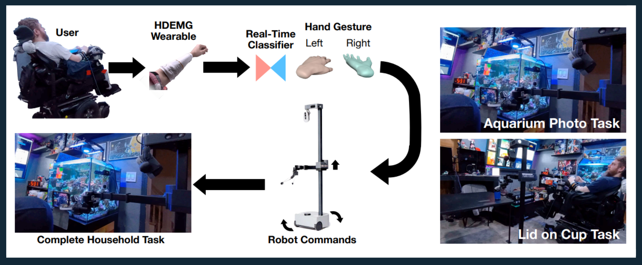 A 12-day in-home study by CMU researchers demonstrates that a user with quadriplegia can independently perform daily activities using bimanual, high-density EMG control of a mobile robot. By combining custom wearable HDEMG-sensing sleeves with a shared-autonomy framework - integrating vision, language, and motion-planning modules - the system successfully translated muscle signals into complex robotic manipulation, allowing the user to perform Activities of Daily Living in their own home without researcher assistance.